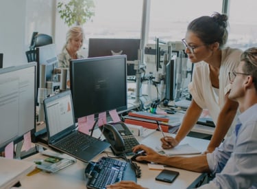 Modern office workspace with professionals working on financial documents.